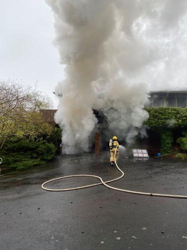 Crews were called at 11.20am to the incident. The car had been driven 15 minutes prior and had then caught fire while parked in the garage.