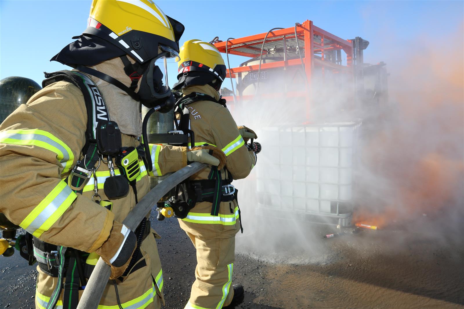 Toora members use a fine-spray to control the HAZMAT chemical spill simulation