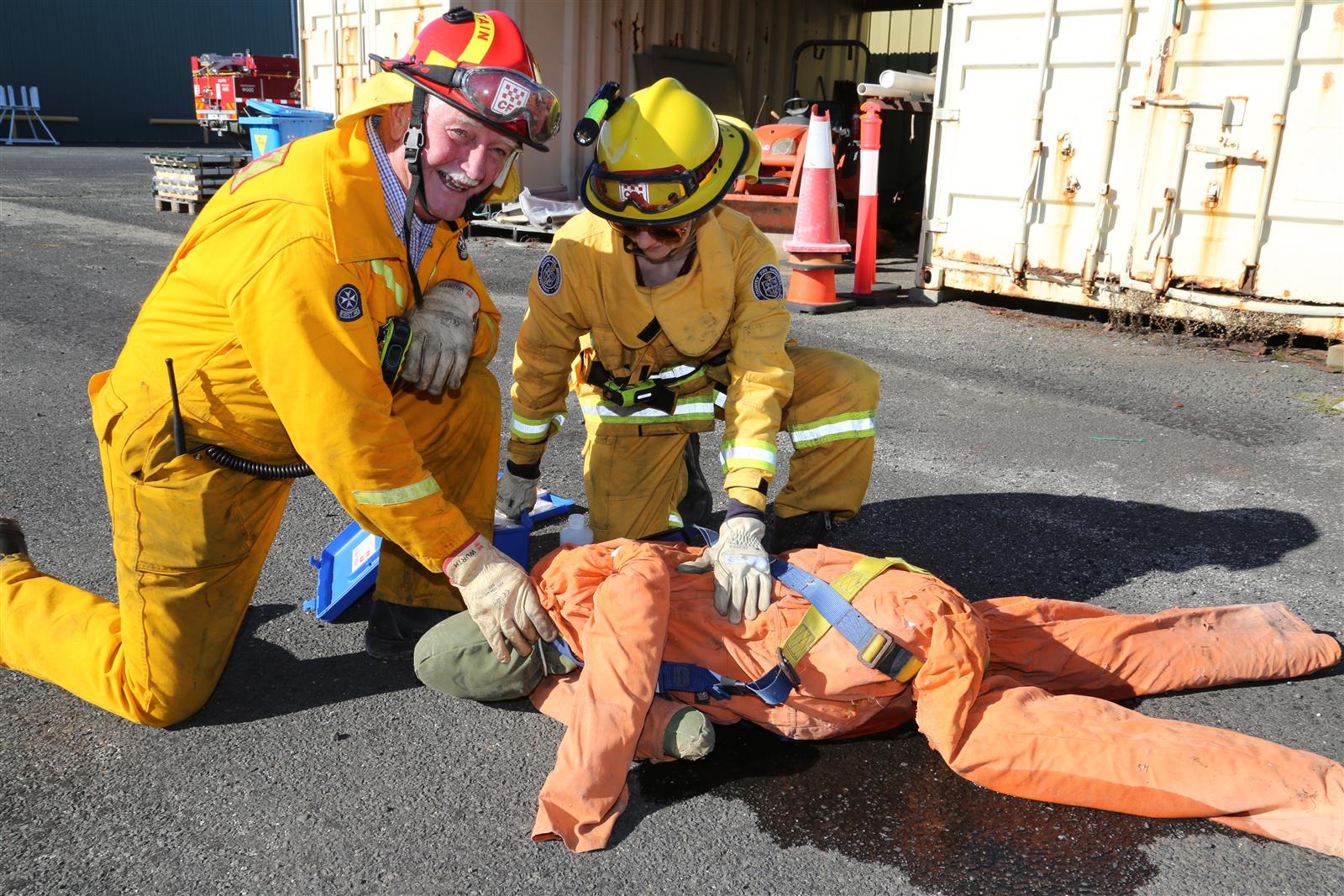 Meeniyan-Stony Creek Captain Paddy Eldred and Toora member Meghan Scoglio put a ‘patient’ into a recovery position before Ambulance Victoria paramedics arrive ‘on scene’.