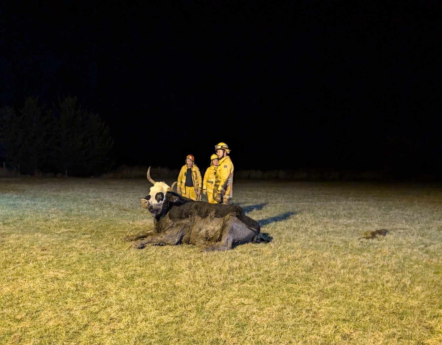 CFA firefighters rescued a curious cow after she wandered out of her paddock into a nearby dry dam, where she became stuck in the mud.